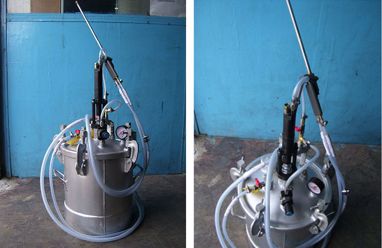 1. Pressurized Spray System – A system is designed consisting of pressurized tank operating at 3 to 6 bar. It is provided with Pressure Gauge, Air release valve, hose assembly, Air Motor (Optional) and Spray Gun. It is available in the following sizes viz. 9ltr, 22ltr & 50ltr. Small & compact design of the spray system facilities ease of operation.